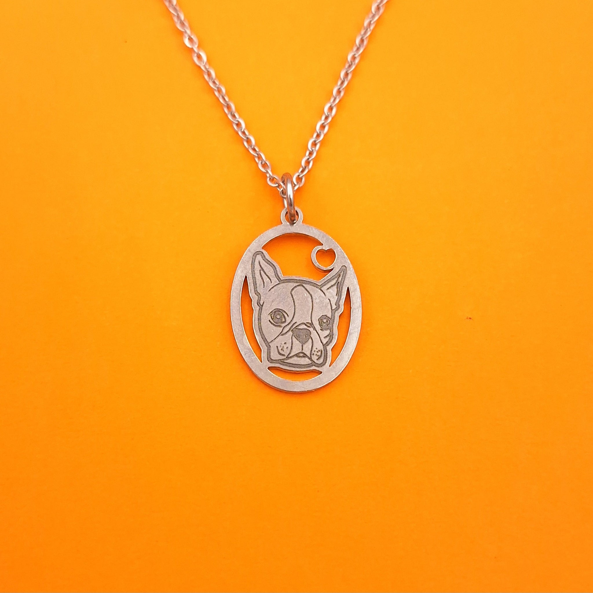 Cute stainless steel Boston Terrier Dog pendant laser engraved and supplied with a chain