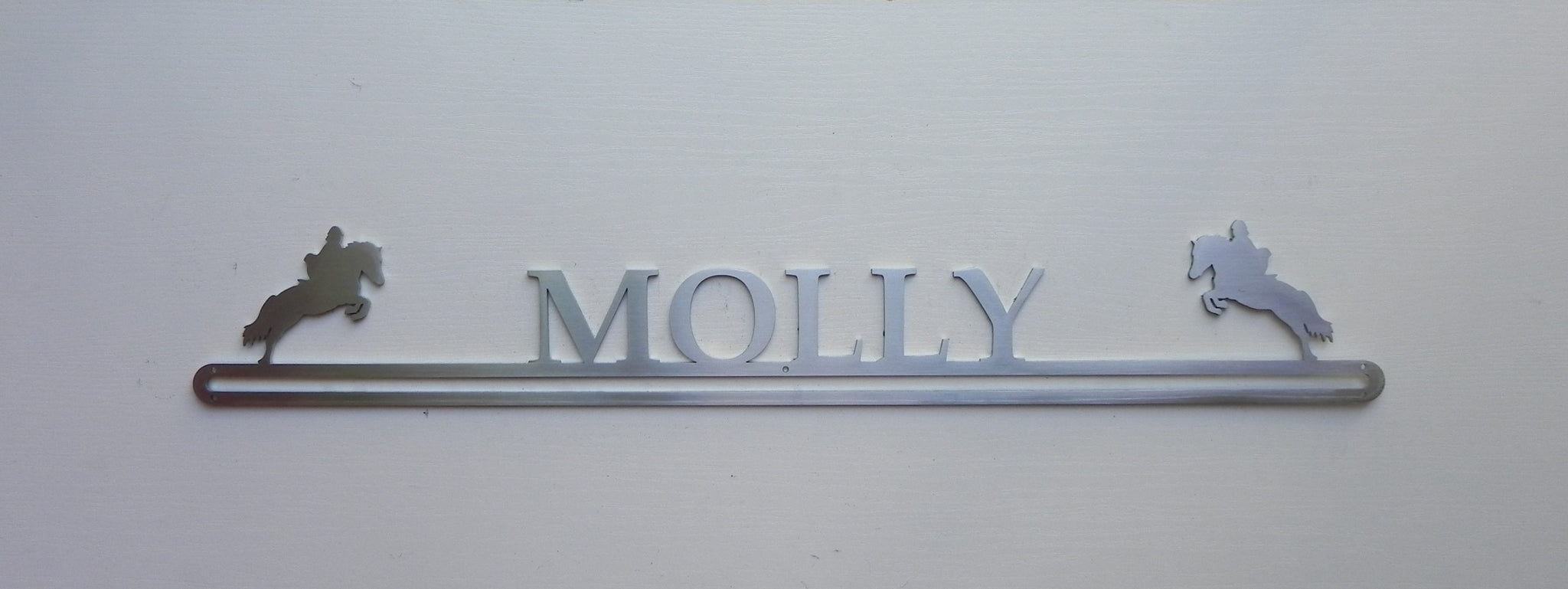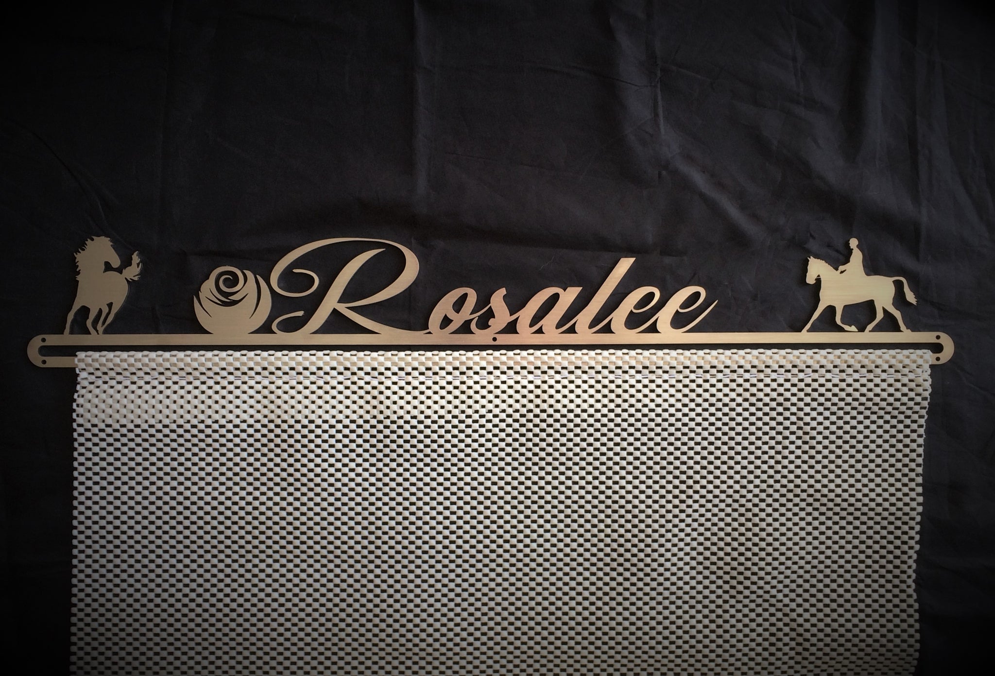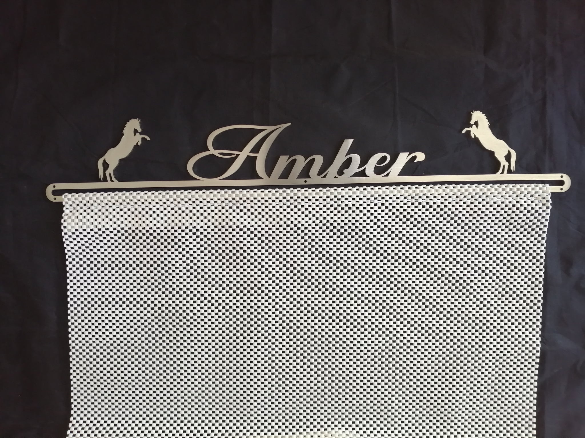 Our stunning Rosette Hangers consists of two parts. The upper section is beautifully laser cut from stainless steel, then brushed for a perfect finish. The lower section, where the rosettes are either pinned or hooked is made from a rubberised mesh sheeting. This allows you to display a large number of both types of rosettes with ease