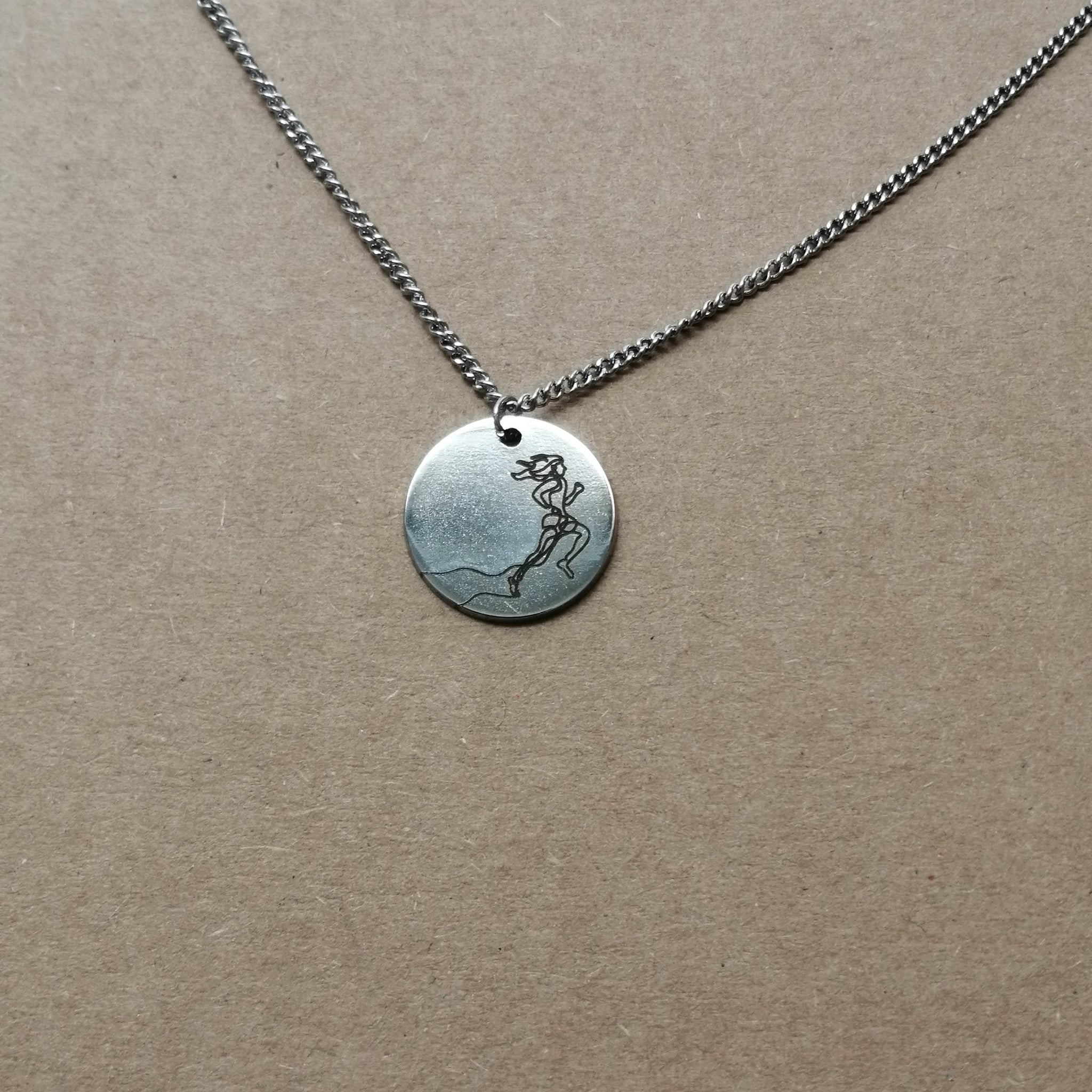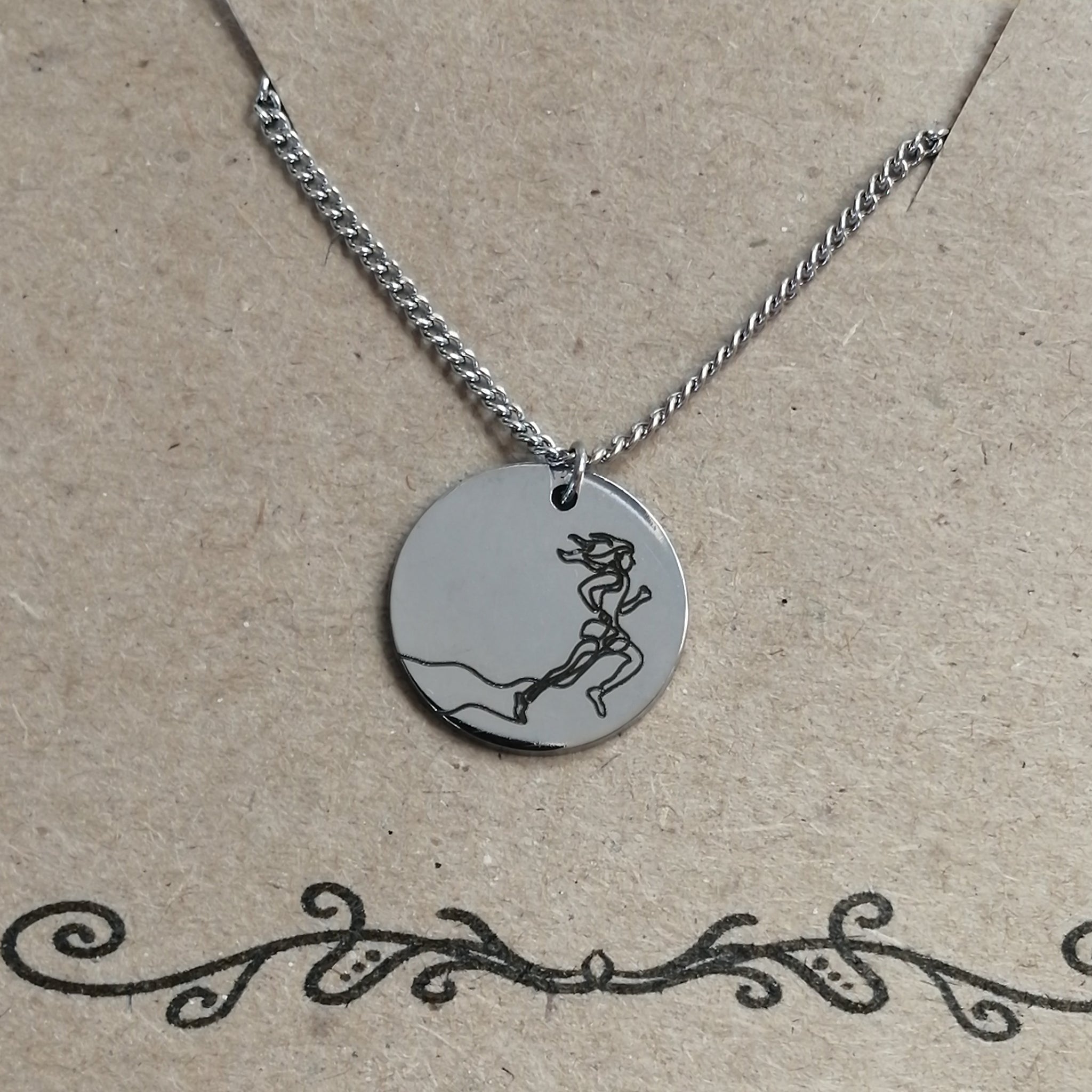 Running Girl laser engraved on a 15mm disc pendant with chain